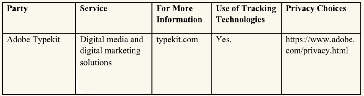 The following table sets out details of the individual tracking technologies we use and the purposes for which we use them. We provide the chart below as a courtesy for all users but we are not obligated to maintain or update it. We are not responsible for third-party sites and their privacy practices as it relates to opt-outs from tracking activities. The following third-parties that collect information from you on our Website have given us notice that you may obtain information on their policies and practices, and in some instances opt-out of certain of their activities.